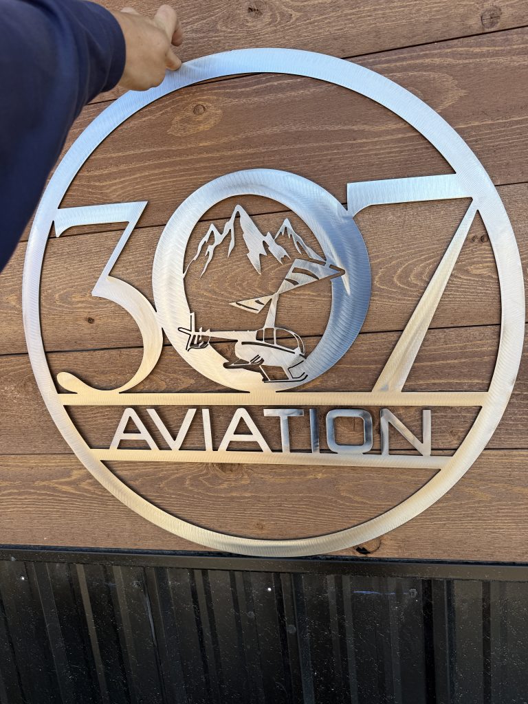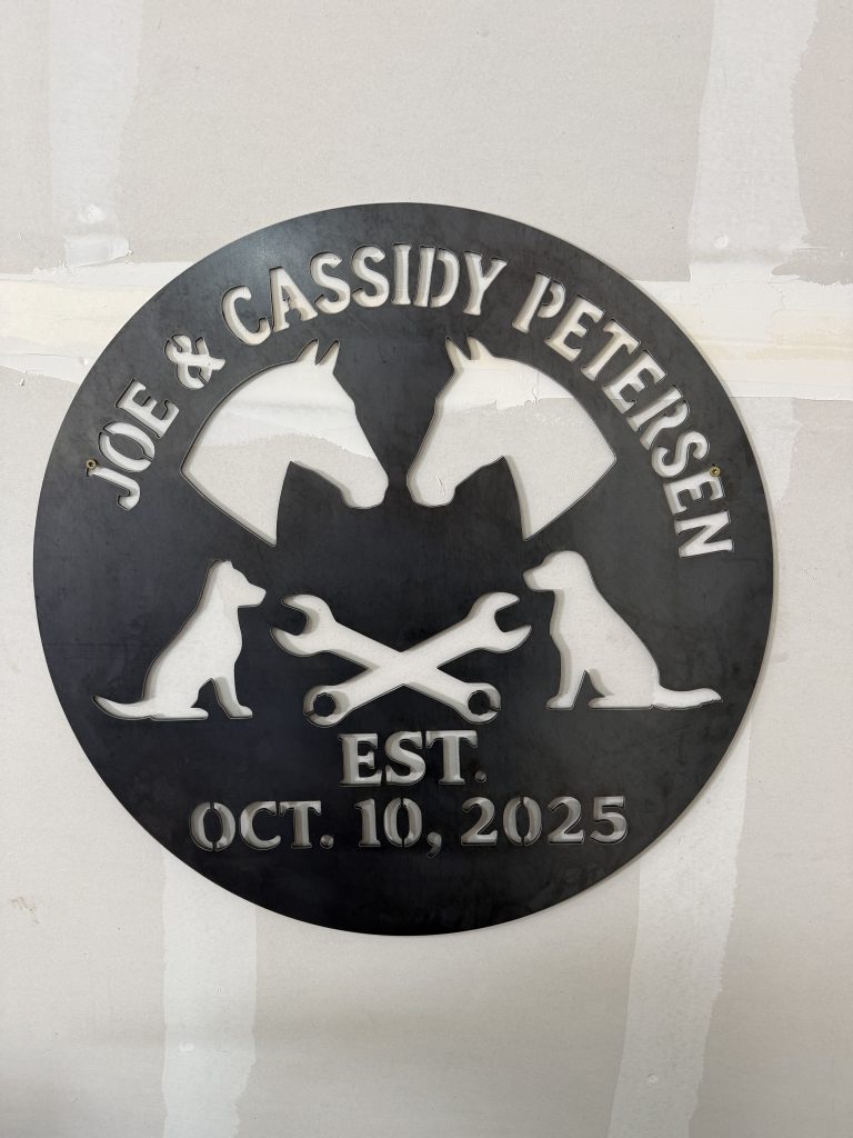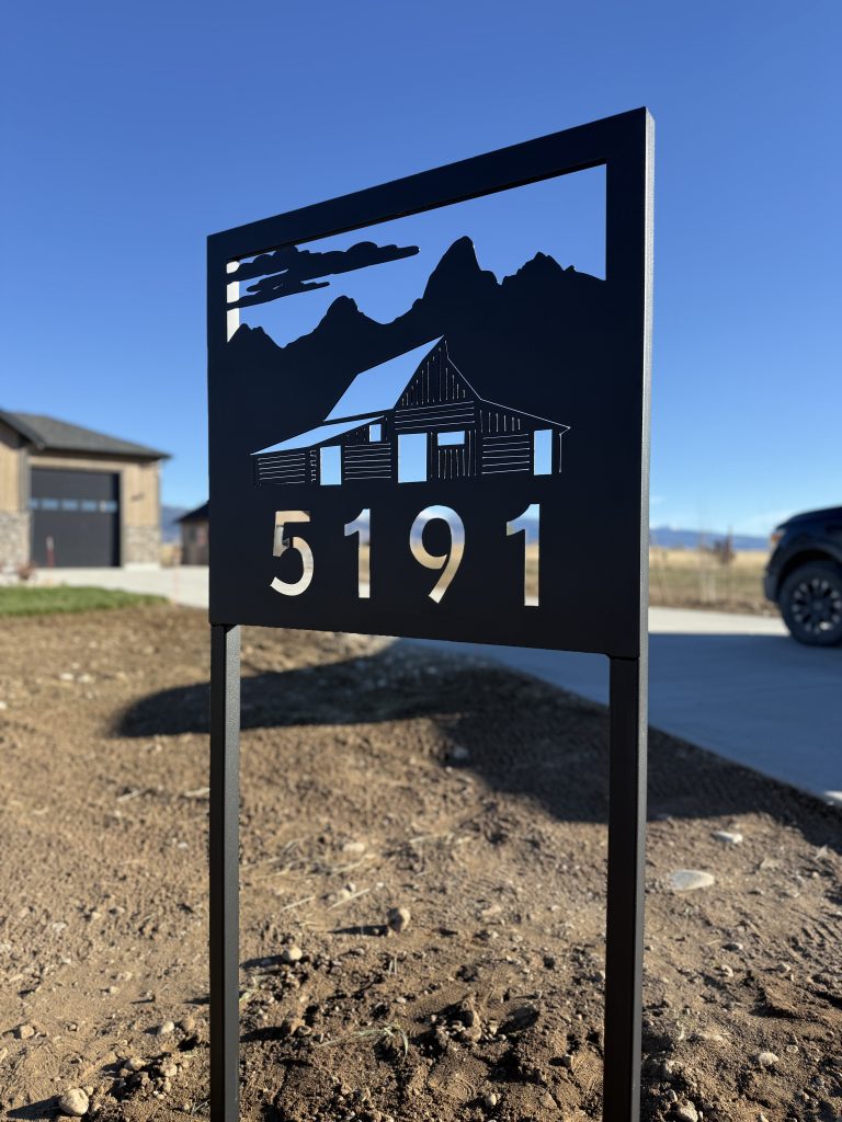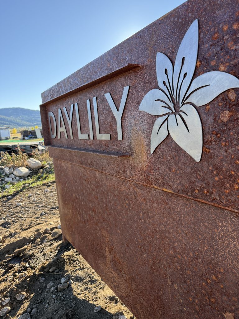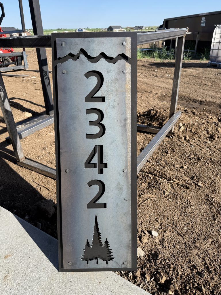 Raw steel ranch entry sign. 12′ wide, 14″ tall.